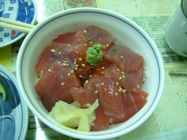 所謂鐵火丼就是白飯上面鋪著鮭魚卵和鮪魚刺身